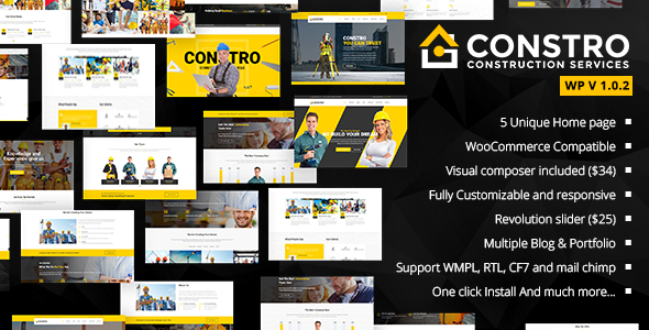 Constro: The Most customisable WordPress Theme Constro is an exclusive multi-purpose 100% responsive WordPress Theme with powerful features. Simple and well-structured coding, high quality and flexible layout, scalable features along with color schemes to create tailor-cut websites. With Visual composer, revolution slider, bootstrap framework, responsive, and various layouts including incredible revolution slider. Constro offers you unfathomable accessibility to build beautiful and customer-oriented websites. Unique designs, eye-catchy portfolio and innovative website building tools work seamlessly to boost your business online. The theme has been Created especially for construction, building, architecture, company, corporate, electrical, handyman, plumber or electrician, engineering, industry, interior, isolation, maintenance, painting, projecting, renovation, mechanic, transport, carpenter, craftsman workshop, painter or similar craftsman or repair business website. MAIN FEATURES OVERVIEW: Visual Composer Page Builder for WordPress ($34 value) included free: Ultimate plugin for building every WordPress site without coding. The only WP Page Builder that powers 1+ million sites. Slider Revolution Responsive WordPress Plugin ($25 value) included free: Build modern and responsive slider presentations quickly and with ease. WooCommerce Ready: Constro theme comes with complete support for the WooCommerce plugin, which enables you to sell your products online. This popular e-commerce plugin will help you to setup a clean and modern shop. Advanced Theme Options: Theme Options allows to craft almost any imaginable design. Take control over the appearance of your site using the Theme Options panel. Make it unique in a few clicks. 100% WPML Multilingual Plugin Ready: Constro theme is fully compatible with the WPML multilingual plugin and we have tested the theme completely with this popular multi-lingual plugin to help you easily translate to your website. 800+ Google Webfonts to Choose From:The theme integrates Google Web Fonts, offering you a large variety of typefaces to choose from when customizing the theme. Translation Ready: Constro is fully prepared for translation to any language using po & mo files. One click DEMO data importer: Get your WordPress Theme installed at the click of a button. Contact Form 7 ready: Create beautiful contact forms with Contactform 7 plugin. RTL Support: RTL languages support. Cross-Browser Compatibility: Supports all major browser (FireFox, Safari, Chrome, IE9, IE10, IE11). Fully Responsive Design Super Mobile-Friendly: With a responsive design and retina ready display, your site will look awesome on any device. MailChimp Support: MailChimp for WordPress helps you add more subscribers to your MailChimp lists using beautiful and simple form. Subscribe your WordPress site visitors to your MailChimp lists, with ease. We have designed this forms and created a subscription element. All you need to do is to connect your form to your MailChimp list and drop the related element in your page. Unlimited Colors options: Constro comes with unlimited colors. You will have thousands of way to change the appearance, according to your preference and your brand. Advanced Blog Options: Different blog post formats including standard, quote, HTML5 video, youtube video, vimeo video, gallery and audio. With Classic, Left Sidebar, Right Sidebar, Full Width, Masonry, 2 Column, 3 Column…. Portfolio Options: Best way to showcase your work with Fullwidth, 3 Columns, 4 Columns and Details. Mega menu: Create wide or normal sub-menus at the same time. Powerful Bootstrap v3+: Built on latest Bootstrap v3+ powerful framework for faster and easier web development. Retina Ready: Constro comes with high-resolution icons. With Constro your website will look awesome on high-density Retina displays and high-resolution screens. 5 Stunning Home Page Options: With 5 different and unique demo homepages gives you options to build your own site. Well Document: Very detailed step by step online and offline documentation has been carefully detailed and completed with super easy to understand instructions giving you the full access to all of its features. Child Theme Compatible: Includes basic child theme! Auto update: Auto-update support Envato Toolkit plugin (theme auto-update plugin). Fully Customizable: Easily change the color of every element you see! The theme is easy for beginners and requires no programming skills to create a website – multiple options and elements will do that for you. Custom Inner page header Backgrounds: Custom Backgrounds on every Page header (Patterns, Images or Solid Color). Multiple Header options: Constro comes with Multiple Header options to choose from, each header has its own set of options, is sure to satisfy your every need. you can change header text color, link color and background color. Sticky Header: You can set header to be sticky on the top. you can also change sticky header logo, text color, link color and background color. Built with HTML5 and CSS3: Coded in HTML5, CCS3 and jQuery. Tons of Pages options: 60+ Pre-configured page layouts for Home, About, Service, F.A.Q., team, Portfolio, Blog, Contact and more! bbPress Plugin fully design integrated! Fast Performance: High performance, super fast with top page speed & yslow ratings. Responsive Carousels: Amazing responsive Carousels will look awesome on any device. Professional and fast 5-star support: Whether you are an expert or a beginner, our Support Team will do its best to provide the best possible and helpful answer for the issues that you are having. And much more… Easy To Use: Unique stunning animated slider No coding knowledge required Visual Composer (No additional license needed, you save $34) Very easy page building per drag and drop 60+ pre-built pages for quick start Flexible easy-to-use page options Enhanced intuitive portfolio and gallery management Very detailed online documentation Creat