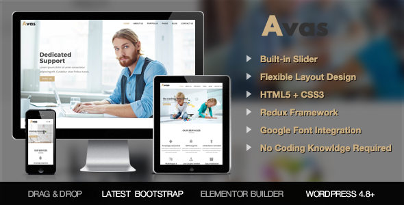 Avas is more flexible Multi-purpose Responsive WordPress Theme. Avas comes with awesome features for your creative business. Avas comes with responsive design and parallax effects. Avas provides you optimal viewing experience which will makes your website looks awesome on all device screens. Avas comes with powerful admin panel with lots of options where you can easily customize your styles, colors, fonts and other elements on the theme option by Redux framework. Avas comes with Elementor Page Builder which is the most powerful and light weight page builder where you can easily play with your elements.